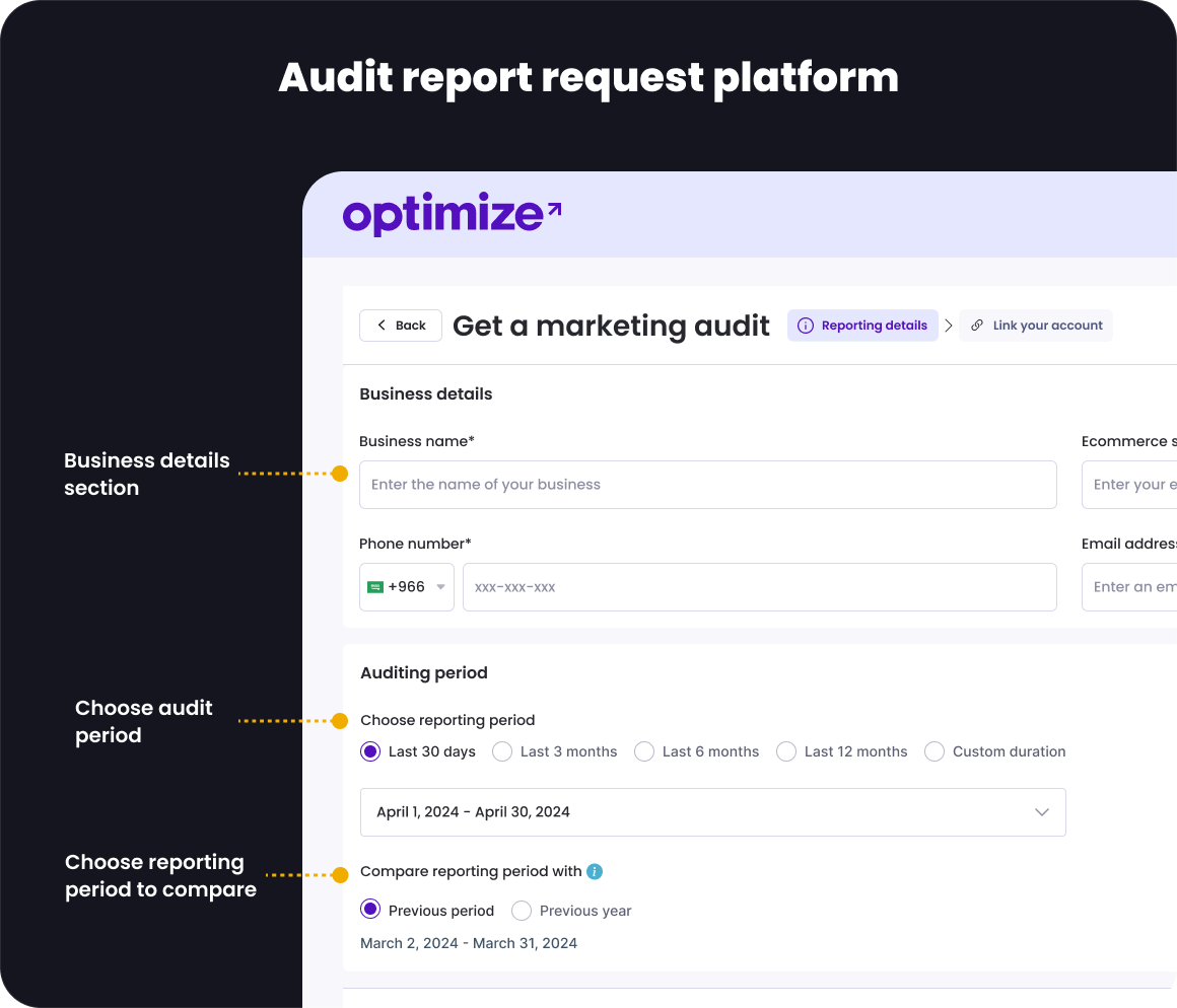 Allow even non-OptimizeApp users to submit audit requests by first collecting essential business details (Business Name, Website URL, Contact Info).