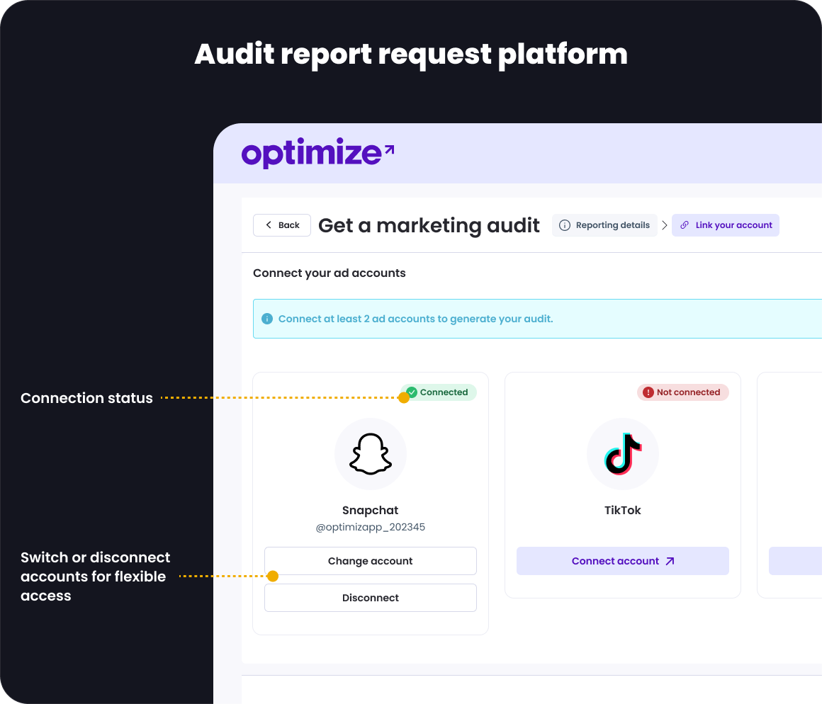 Redesign the connection process for Google, Meta, TikTok, and Snapchat ad accounts to minimize confusion and setup time.